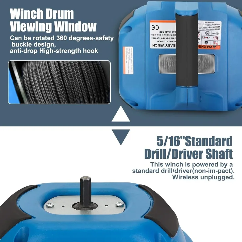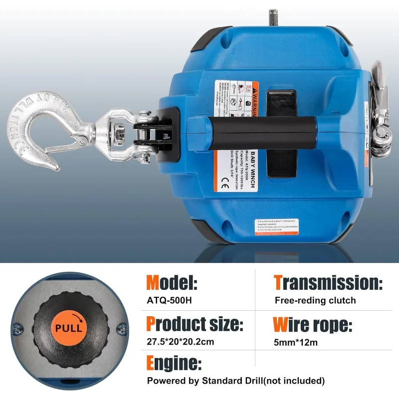 Portable Drill Winch of 1000 LB, Red Handheld Drill Winch with 40 Foot Synthetic Rope, Rotate The Hook 360 Degrees, for Lifting & Dragging (Blue)
